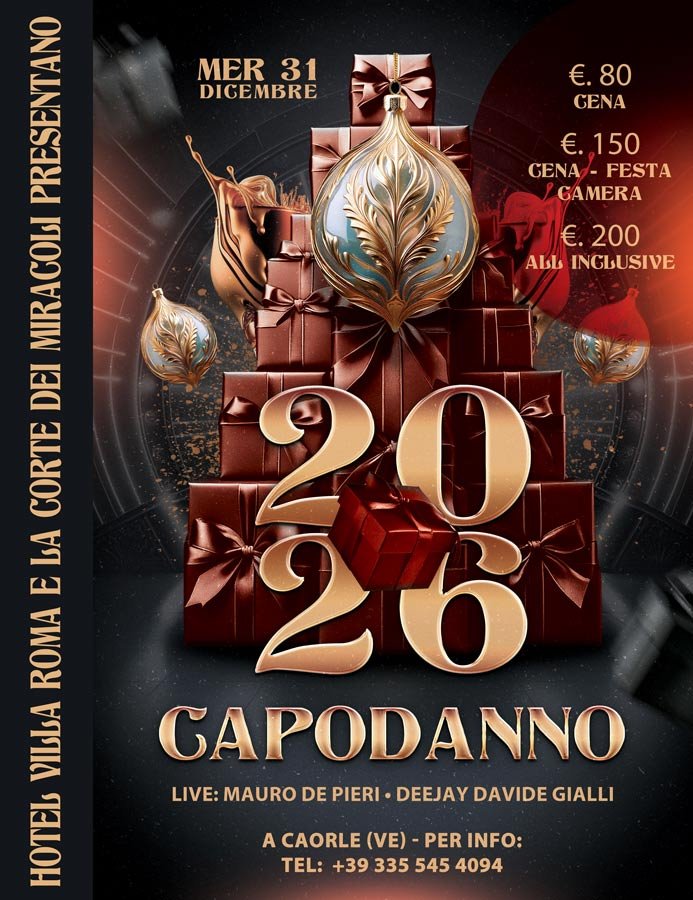 Mercoledì 31 dicembre ti aspettiamo a Caorle (VE) presso Hotel Villa Roma e La Corte dei Miracoli, per un evento che unisce eleganza, divertimento e musica dal vivo in una location raffinata. Potrai scegliere tra la cena gourmet, la formula cena + festa in camera o l’esperienza all inclusive, per iniziare il 2026 con il massimo dello stile e della buona compagnia.